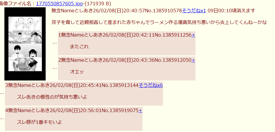 | … | 38無念Nameとしあき26/02/09(月)12:52:38No.1386113773そうだねx4>どれだけ過激なもの描けるかのチキンレースやってんのか |
