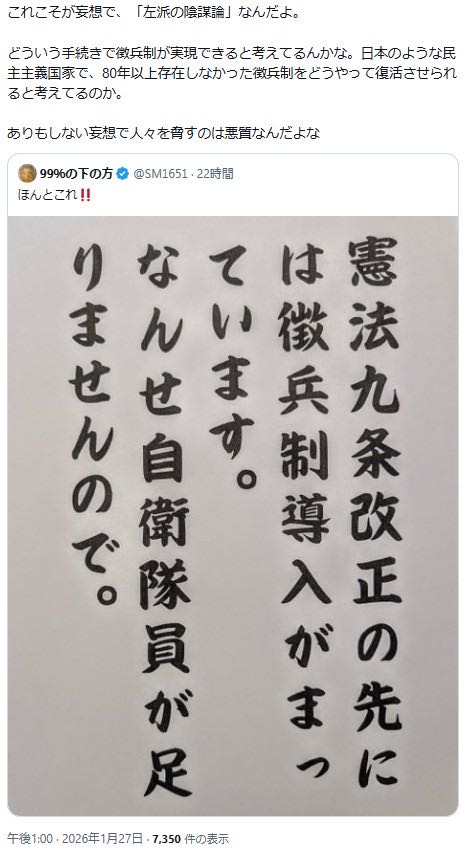 | … | 71無念Nameとしあき26/02/09(月)16:18:58No.1386150553そうだねx8そもそも徴兵云々言ってるのがパヨ界隈だけなんだよな |
