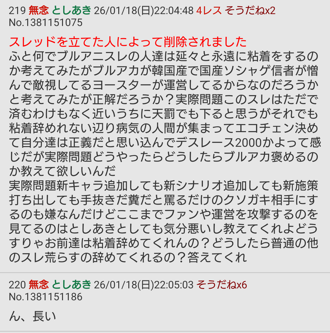 | … | 214無念Nameとしあき26/02/09(月)17:29:11No.1386162967そうだねx5>>せんせぇのスレで叩いて暴れてた馬鹿ならこっちでもお断りわよ…… |