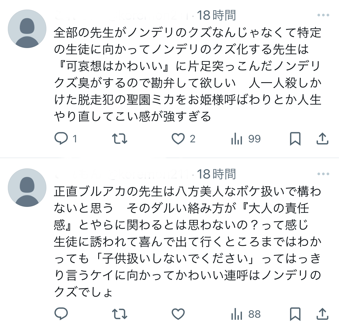 | … | 275無念Nameとしあき26/02/09(月)17:54:17No.1386168066+>黒見セリカってキャラのpixiv大百科の記事で文字数かなり少ないんわよね…ホシノとかヒナとかハゲの記事の数分の1ってレベルだから悲しくなるんわよね |