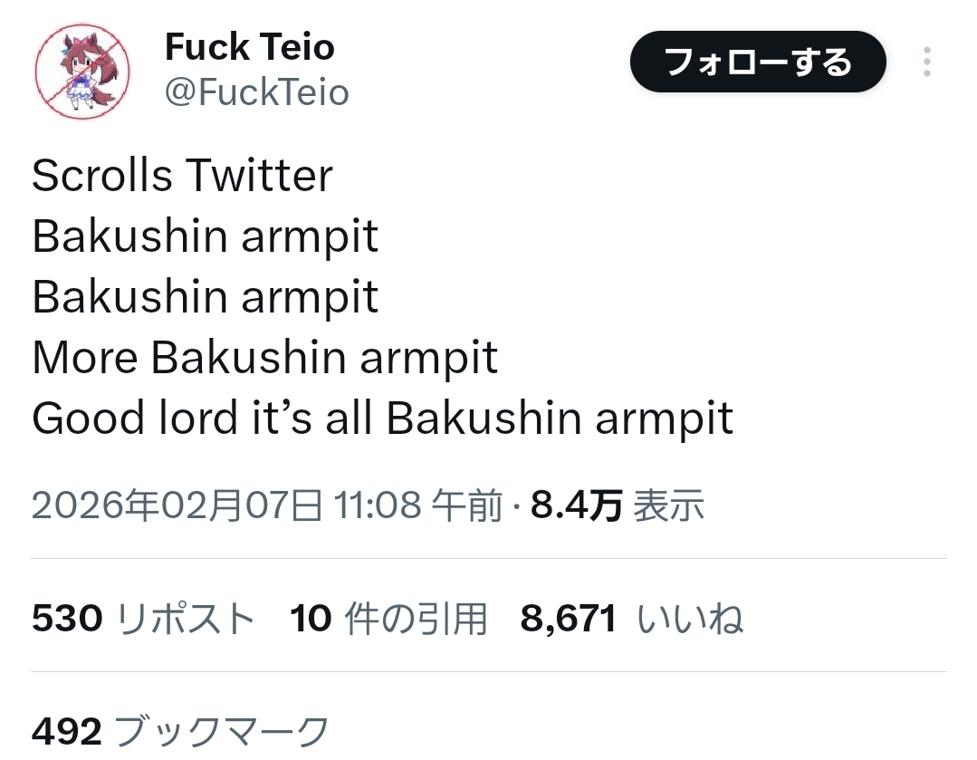 | … | 23無念Nameとしあき26/02/09(月)16:41:55No.1386154483そうだねx12日ぐらい前からTLにひたすらバクシンの腋画像が流れてくる |