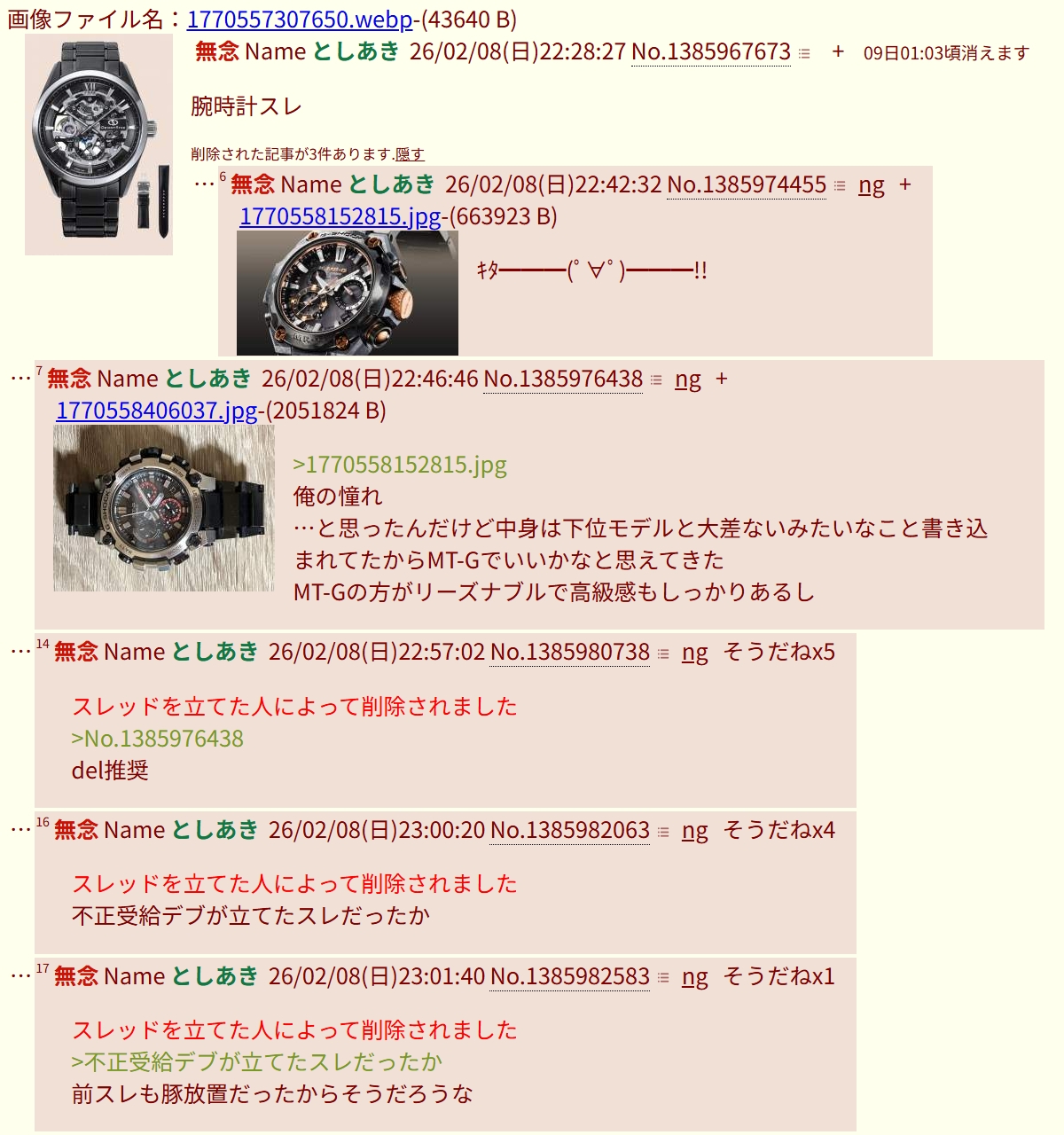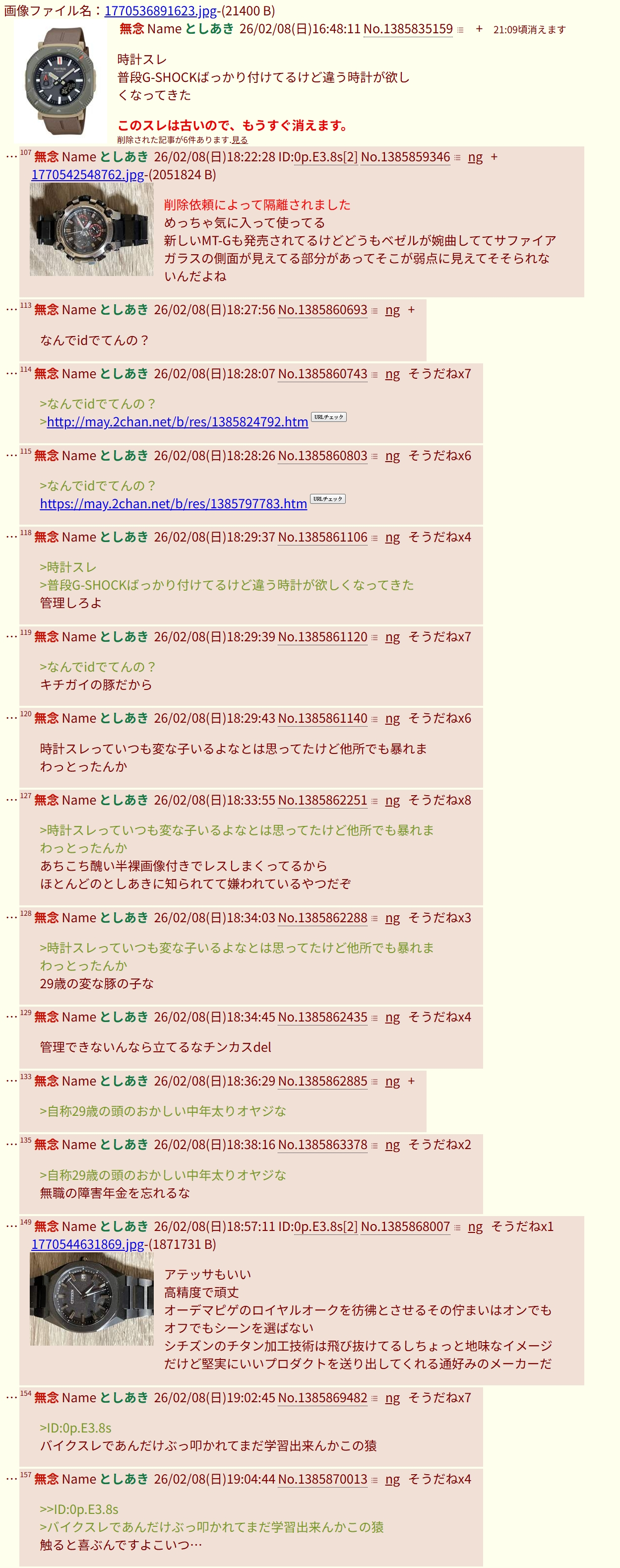| … | 92無念Nameとしあき26/02/09(月)18:35:09No.1386177494そうだねx3>そういえば昨日の夜22時30分頃に立ってた時計スレは面白かったな |