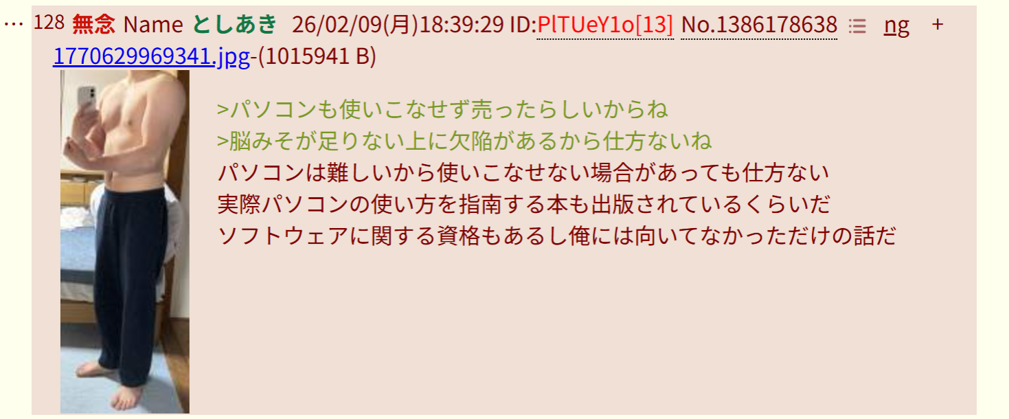 | … | 343無念Nameとしあき26/02/09(月)19:21:13No.1386189981+>パソコン使えないってsyamu以下だぞ |