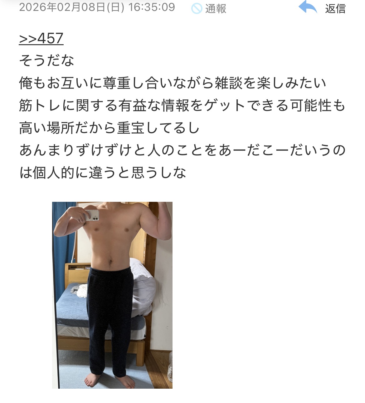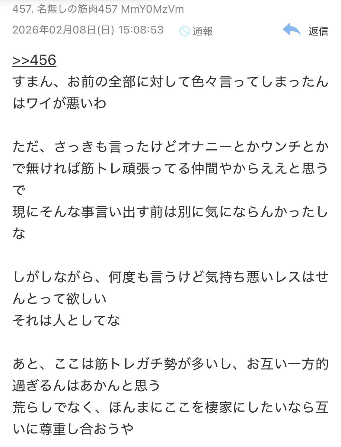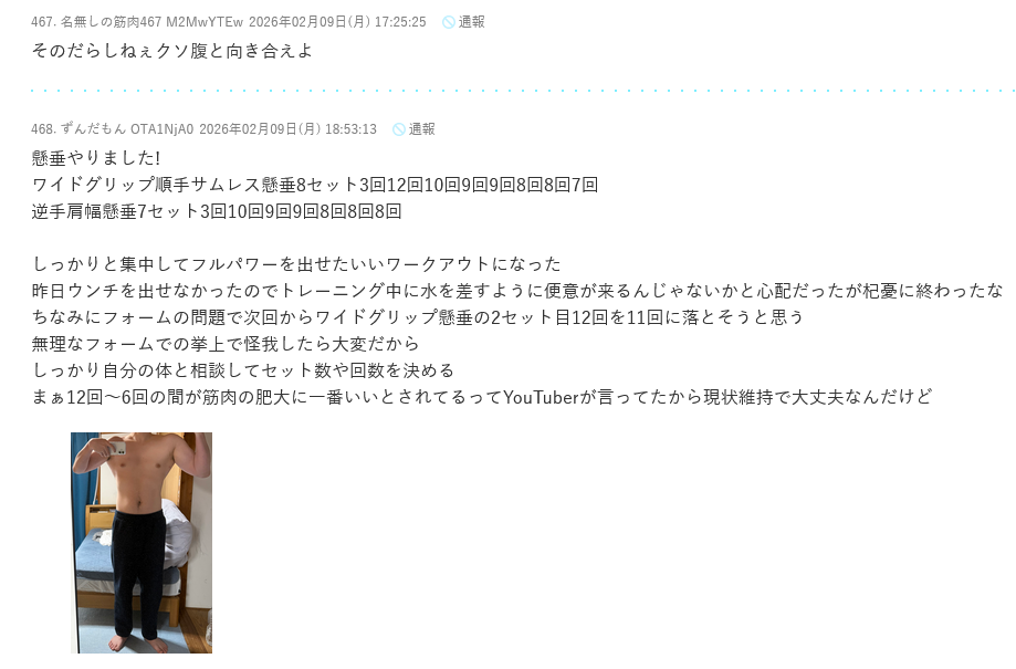 | … | 59無念Nameとしあき26/02/09(月)18:30:03No.1386176253そうだねx5マトモに筋トレや懸垂を語りたければ自分でスレ立てて豚禁止にするんだな |