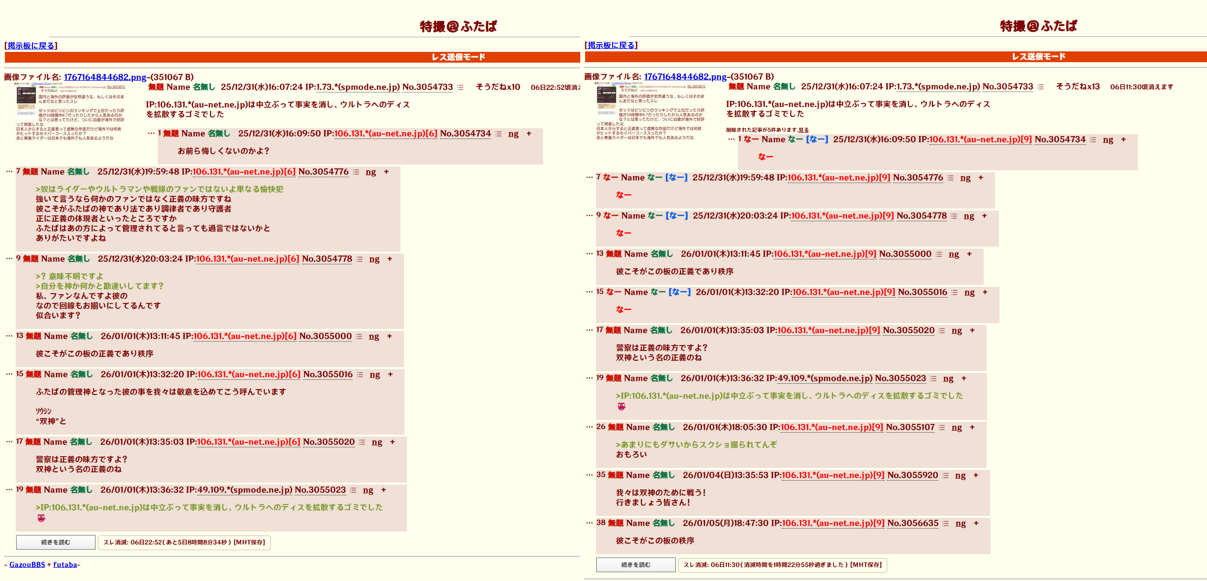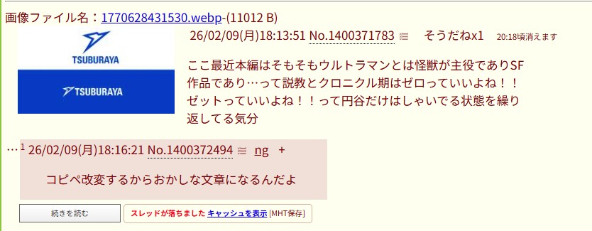 | … | 17無念Nameとしあき26/02/09(月)18:48:44No.1386181008+>>今の円谷プロと社長のアホさ加減を知れるスレです |