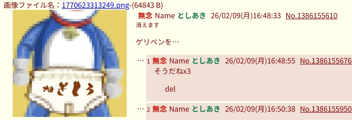 | … | 21無念Nameとしあき26/02/09(月)18:57:57No.1386183433+https://may.2chan.net/b/res/1386176007.htm |