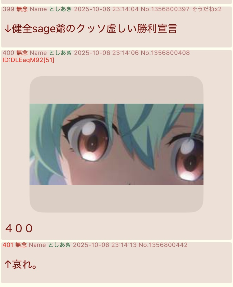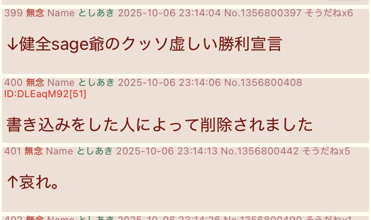| … | 35無念Nameとしあき26/02/10(火)10:09:04No.1386311044そうだねx8支援者💢「sage爺教がー!!うんこ教団がー!!」 |