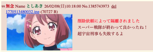 | … | 3無念Nameとしあき26/02/10(火)07:03:53No.1386293016そうだねx3削除依頼によって隔離されました |