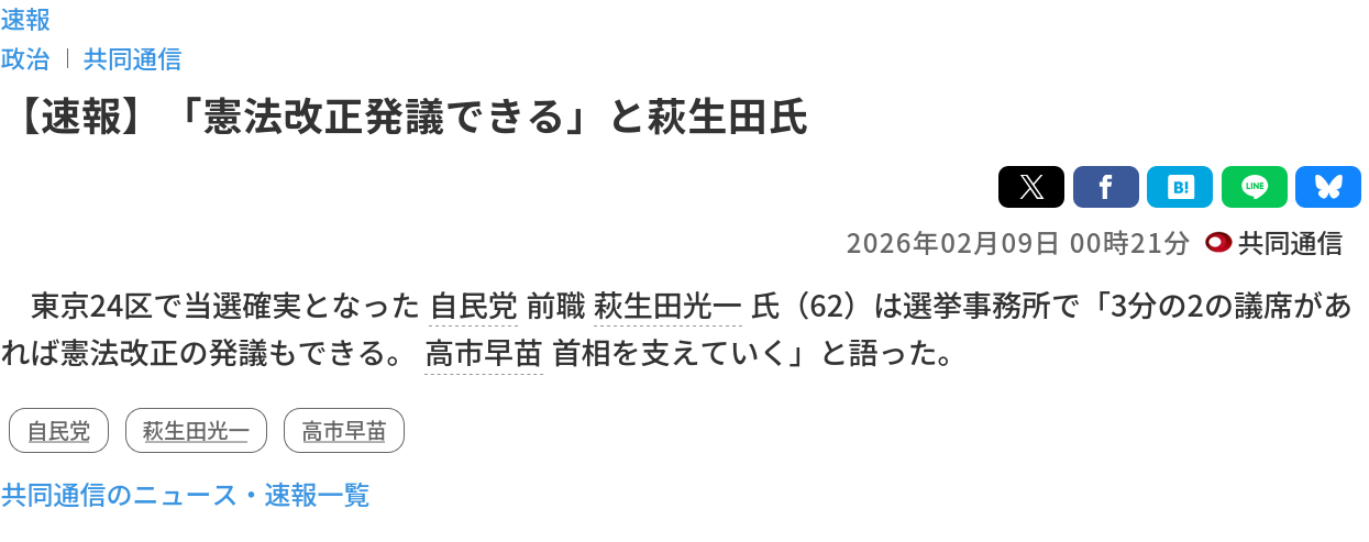 | … | 247無念Nameとしあき26/02/10(火)10:55:01No.1386316953そうだねx1>【速報】「憲法改正発議できる」と萩生田氏 |