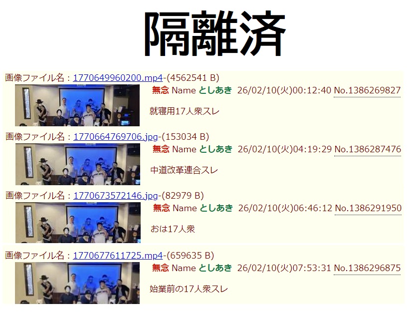 | … | 108無念Nameとしあき26/02/10(火)12:06:44No.1386327328+>掲示板荒らしが集まってオフ会を開いて集合写真を撮って荒らしている掲示板に晒しただけなのに… |