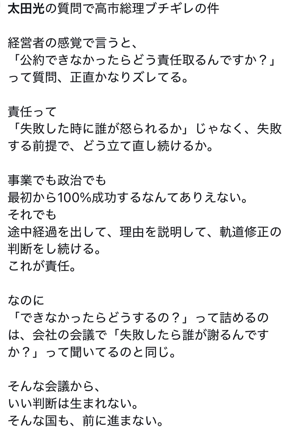 太田が叩かれたけど実際映像見ると太田の態度はおかしくないどころか高市が関西弁で恫喝してるから印象だいぶ違うね上限1000レスに達しました