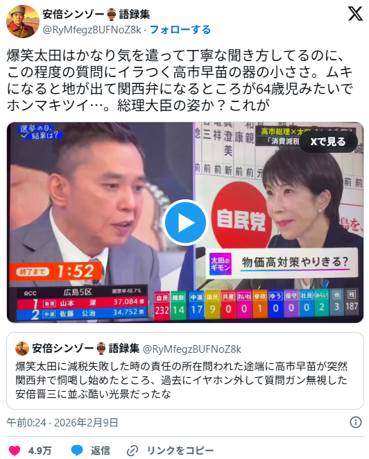 | … | 91無念Nameとしあき26/02/10(火)12:31:06No.1386332112そうだねx1生放送見てたけど太田も感じ悪かったけど急に口調変わる高市も怖かった |