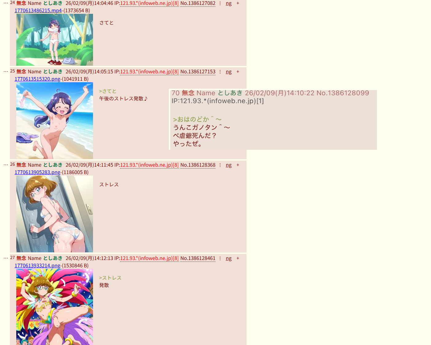 | … | 17無念Nameとしあき26/02/10(火)12:42:40No.1386334468そうだねx1はよくたばれロリコンジジイスレ豚 |