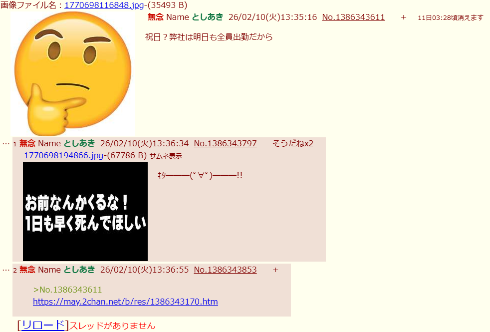 | … | 6無念Nameとしあき26/02/10(火)12:50:35No.1386336145そうだねx3>殺すぞボケェ |