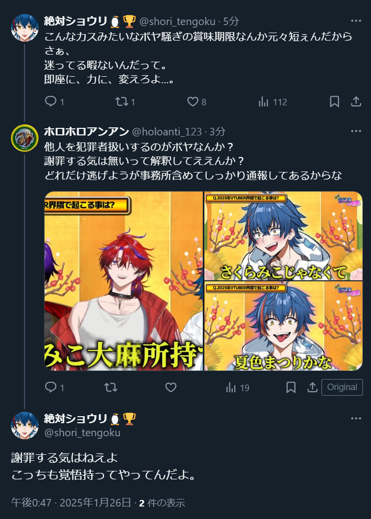 | … | 984無念Nameとしあき26/02/10(火)17:42:11No.1386381079そうだねx1ハヤトはにじさんじ攻撃しようとして思いっきりブザマ晒したなぁ |