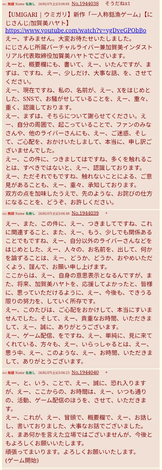 | … | 62無念Nameとしあき26/02/10(火)13:40:02No.1386344331そうだねx6>どうでもいいけど加賀美ハヤトじゃない名義の人が過去にやった事を |