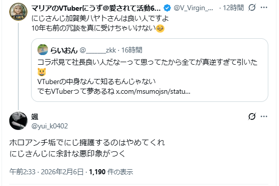 | … | 61無念Nameとしあき26/02/10(火)13:39:41No.1386344279そうだねx22>こんなのが優遇ライバーとかにじ終わってるな |