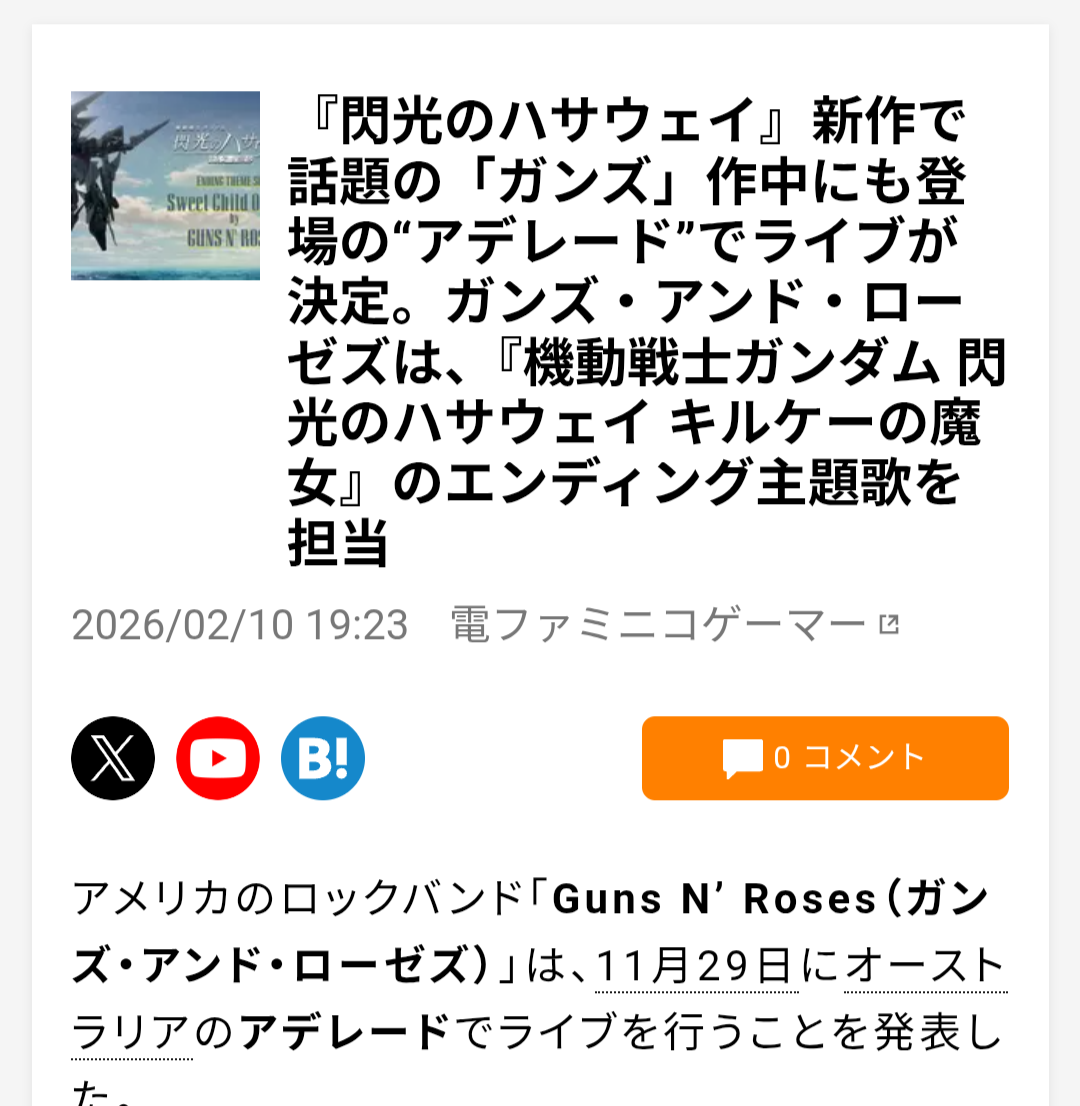 | … | 39無念Nameとしあき26/02/10(火)21:26:30No.1386439660そうだねx5『閃光のハサウェイ』新作で話題の「ガンズ」作中にも登場の“アデレード”でライブが決定 |