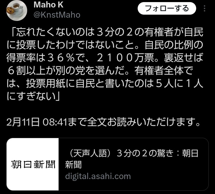 | … | 51無念Nameとしあき26/02/10(火)21:23:42No.1386438848そうだねx1>つまりほぼ全有権者… |