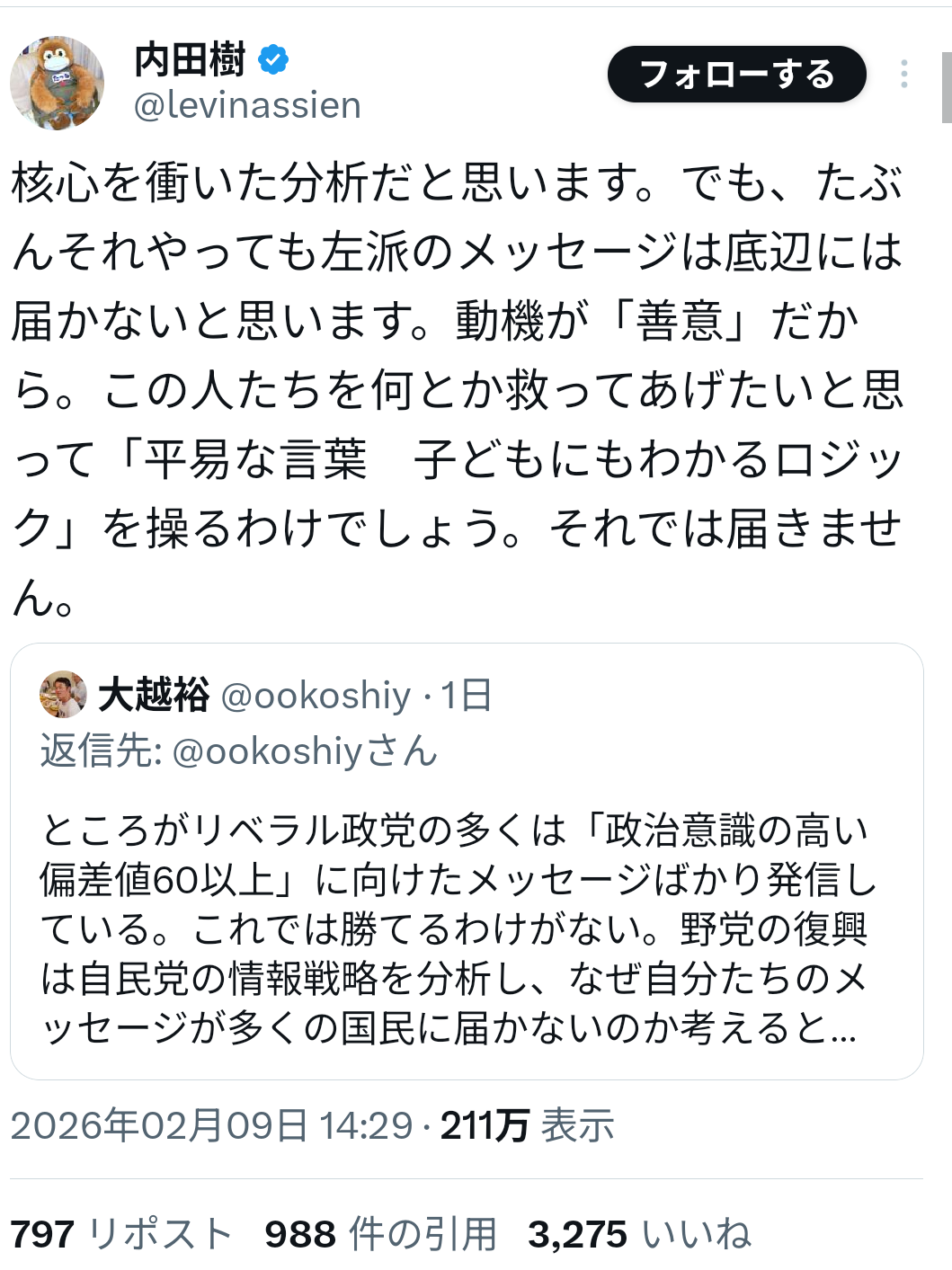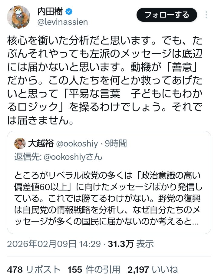 | … | 946無念Nameとしあき26/02/10(火)22:15:04No.1386454179そうだねx3>>>>「俺達が負けたのは支持者を馬鹿にしたせい」 |