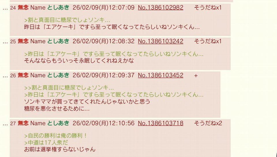 | … | 129無念Nameとしあき26/02/11(水)00:07:04No.1386482857+デブソンキがまた敗北宣言連投を始めたか… |