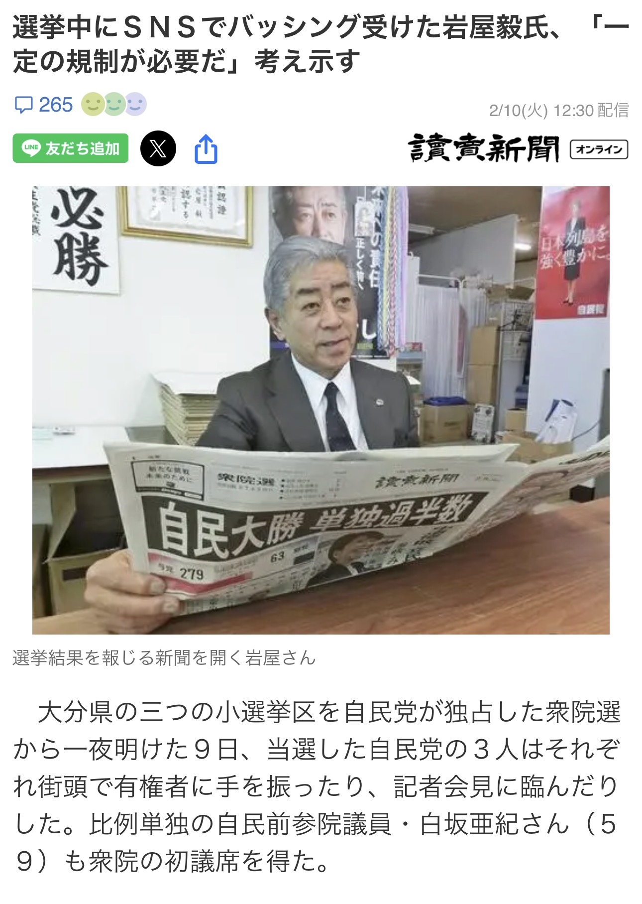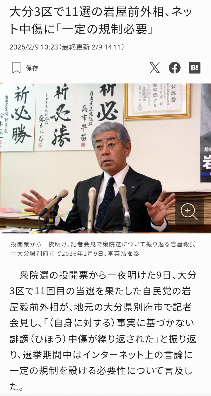 | … | 87無念Nameとしあき26/02/11(水)01:38:23No.1386497647そうだねx40 1770741503884.jpg-(391478 B) 選挙中にSNSでバッシング受けた岩屋毅氏、「一定の規制が必要だ」考え示す |