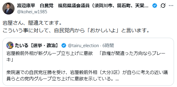| … | 84無念Nameとしあき26/02/11(水)01:37:51No.1386497587そうだねx22>岩屋毅前外相が新グループ立ち上げに意欲 「政権が間違った方向ならブレーキ」 |
