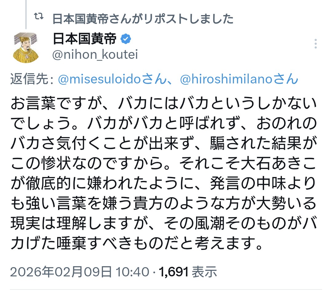 | … | 817無念Nameとしあき26/02/11(水)10:22:22No.1386540567+>日本がおかしくなっていく |
