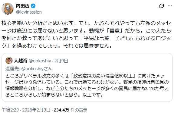 | … | 434無念Nameとしあき26/02/11(水)10:24:43No.1386540965+>日本人は左派右派を正しく理解していないよ |