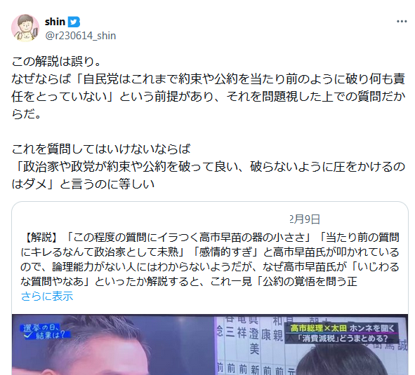 | … | 51無念Nameとしあき26/02/11(水)02:56:14No.1386504368+基本的に自民のタカ派は中道左派です |