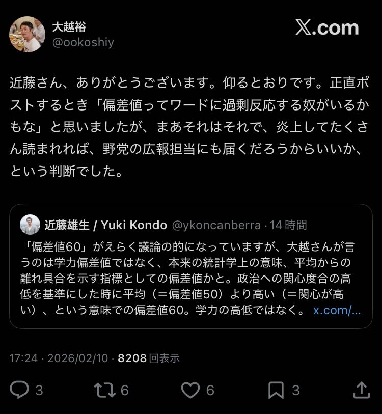 | … | 79無念Nameとしあき26/02/11(水)04:18:05No.1386507841そうだねx6>左派の主張は偏差値60以上にしか届かず底辺は理解できないんだぞ |