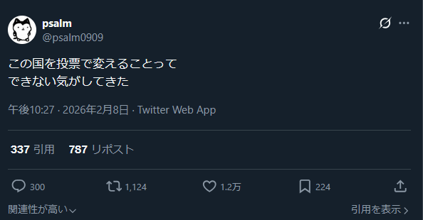 | … | 72無念Nameとしあき26/02/11(水)04:11:16No.1386507646そうだねx10>Xでは相変わらず不正選挙とか自民は有権者の2割しかとってないのに何が民意だとか好き放題やってるぞ |