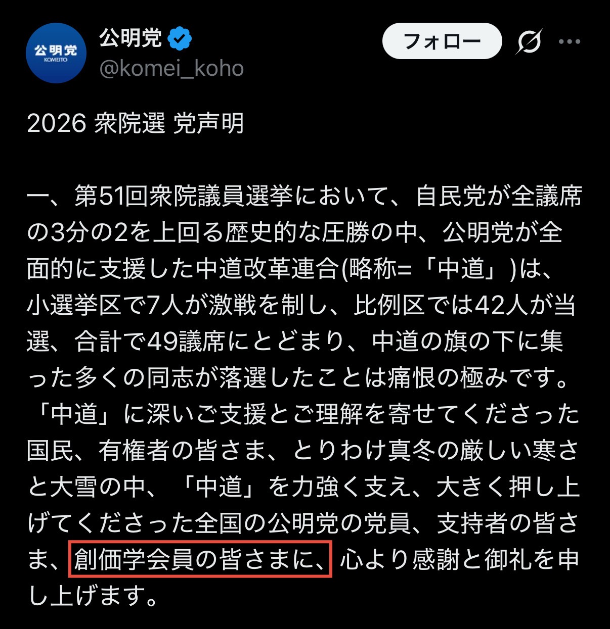 | … | 23無念Nameとしあき26/02/11(水)15:18:35No.1386602484そうだねx1>総会のライブ見たけど元公明議員殆ど発言してないなそれはそれで怖え あと次の比例は最大配慮する(しない)が見えて透ける回答だったな |