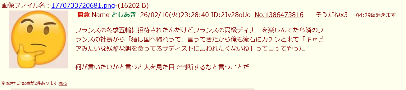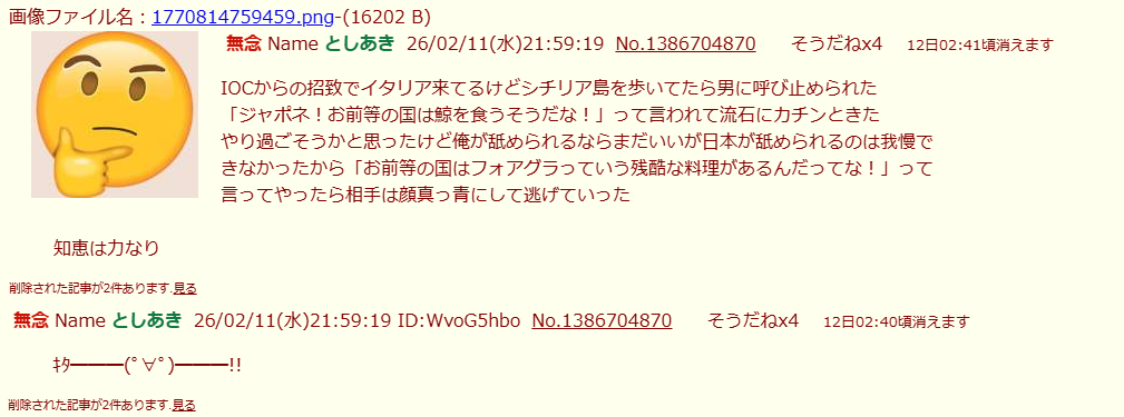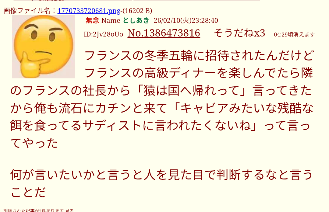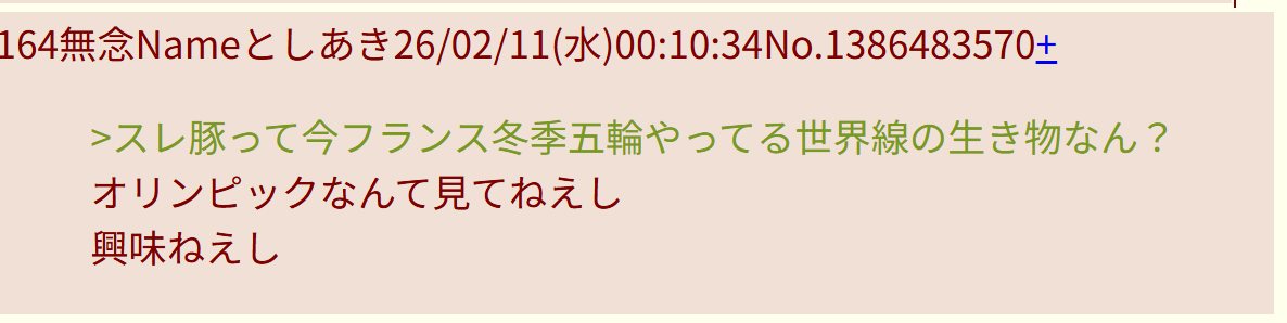 | … | 283無念Nameとしあき26/02/11(水)23:15:51No.1386727030そうだねx3 1770819351667.jpg-(27740 B) >オリンピックなんかに興味あるわけねーだろゴミ虫 |