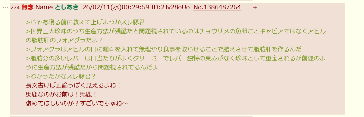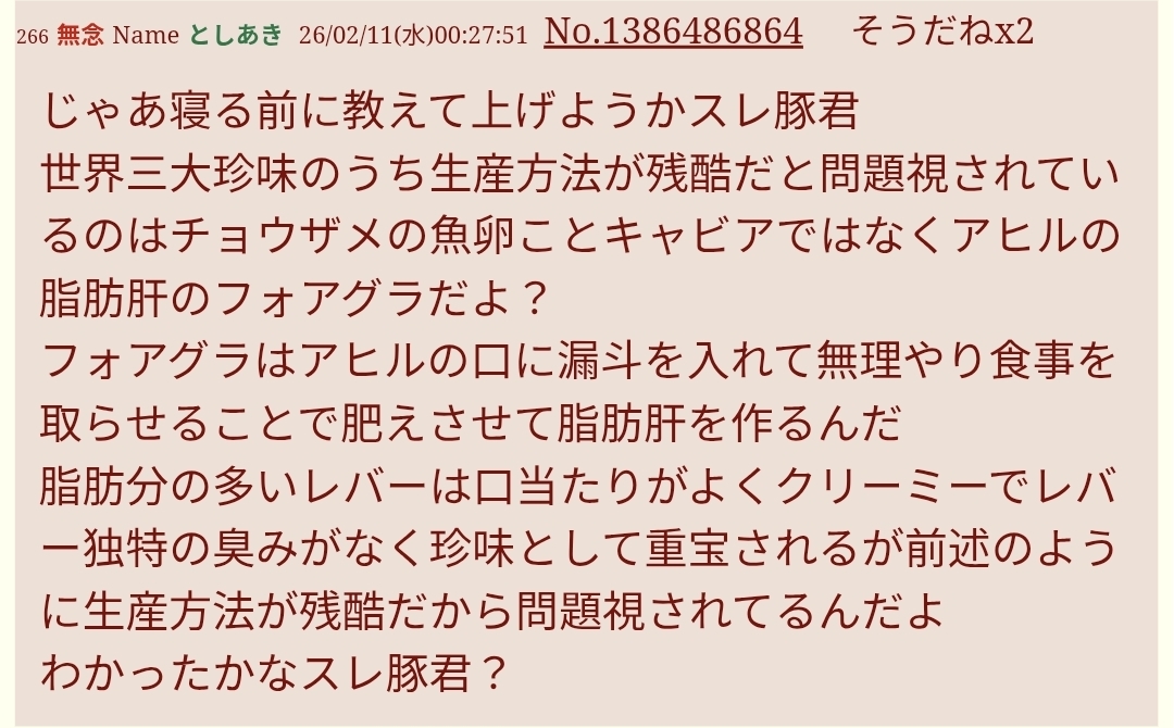 | … | 14無念Nameとしあき26/02/11(水)22:08:11No.1386707463そうだねx8>お前等の国はフォアグラっていう残酷な料理があるんだってな!」 |