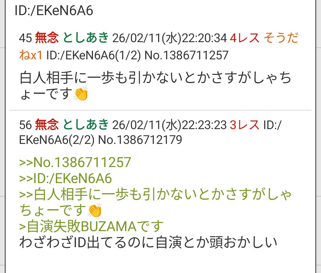 | … | 61無念Nameとしあき26/02/11(水)22:24:30No.1386712516そうだねx3 1770816270132.jpg-(383793 B) >わざわざID出てるのに自演とか頭おかしい |