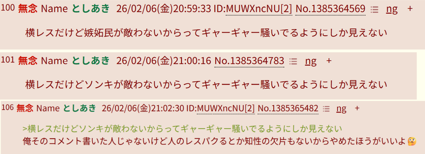 | … | 74無念Nameとしあき26/02/11(水)22:27:17No.1386713425そうだねx5>わざわざID出てるのに自演とか頭おかしい |