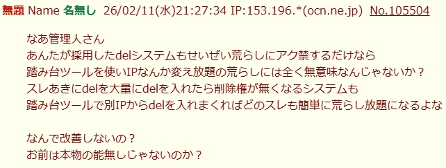 | … | 73無念Nameとしあき26/02/11(水)22:26:50No.1386713279そうだねx7>ID付きで正論言うことに何か問題でも? |