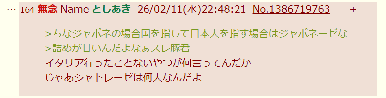 | … | 40無念Nameとしあき26/02/11(水)22:18:19No.1386710585そうだねx5>横レスだけどイタリア行ったことないやつが喚いてもな… |