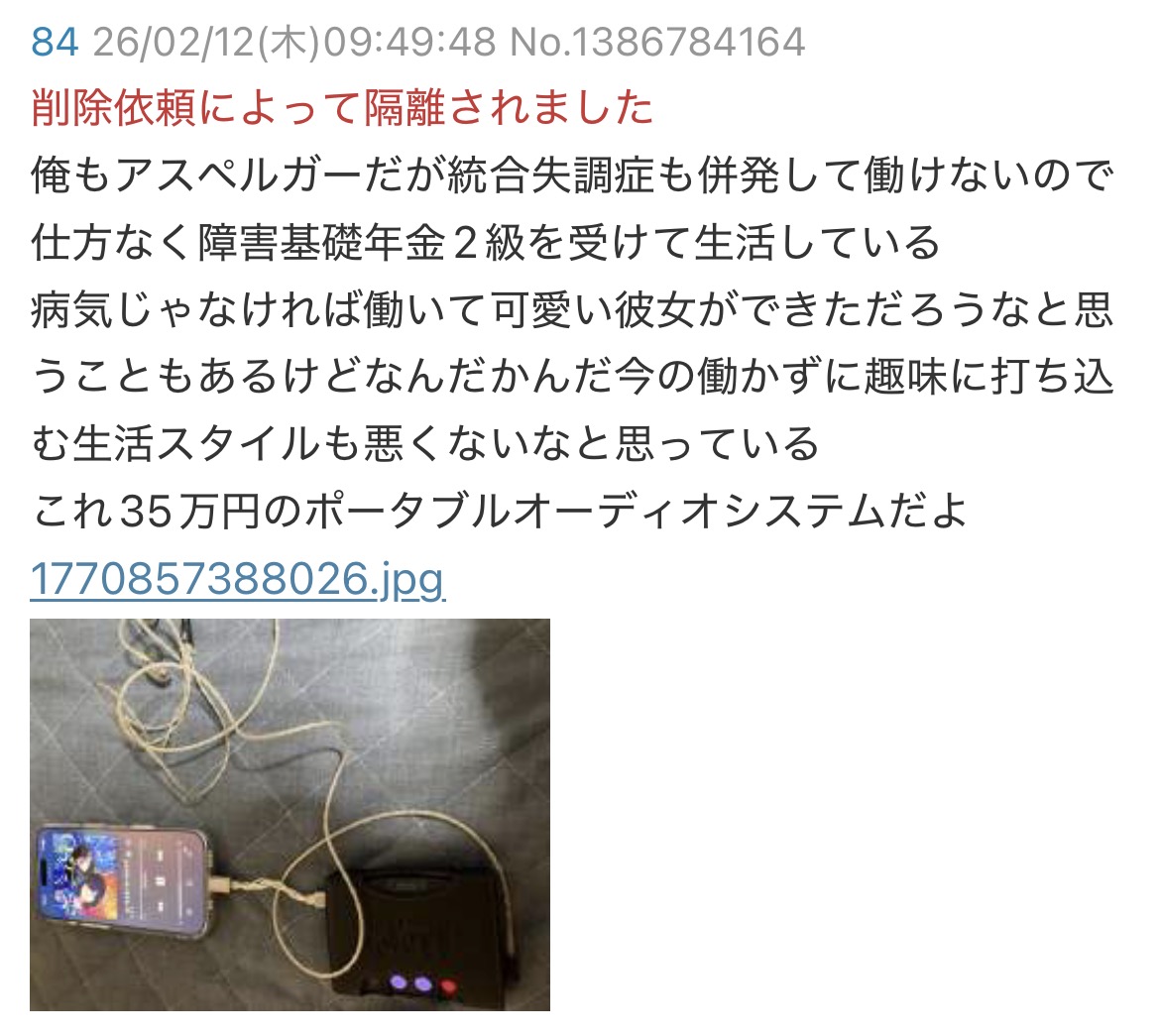 | … | 524無念Nameとしあき26/02/12(木)14:22:35No.1386825085+>それでB型作業所に彼女狙いに行くとか歩く災害かよオンメェ |