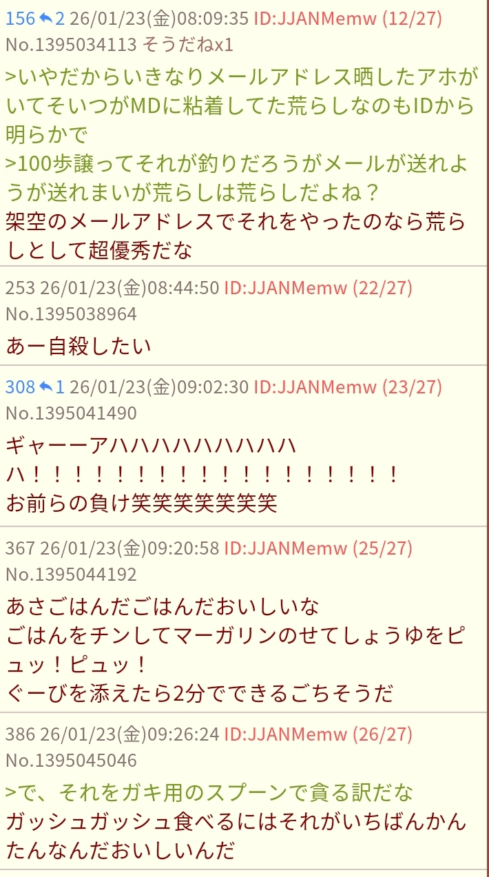 | … | 46無念Nameとしあき26/02/12(木)15:07:51No.1386831824+管理人さん詐称して石川県で寿司食ったと喚いてるな |