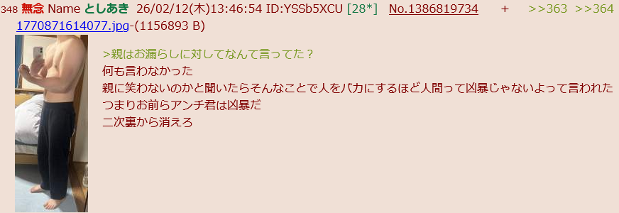 | … | 51無念Nameとしあき26/02/12(木)16:22:43No.1386843894+なんで寝小便漏らすんだよ |