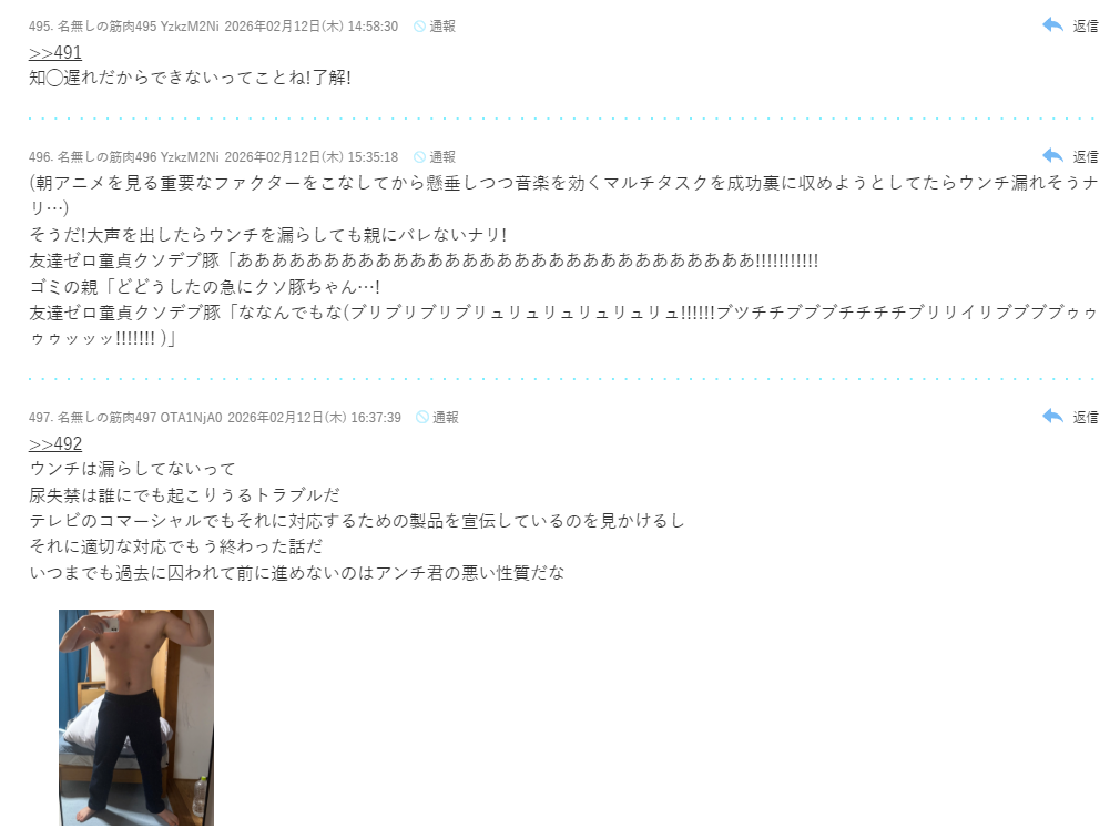 | … | 83無念Nameとしあき26/02/12(木)16:29:10No.1386844928+>懸垂中にウンチが出てしまったがとか書き込んでたし |