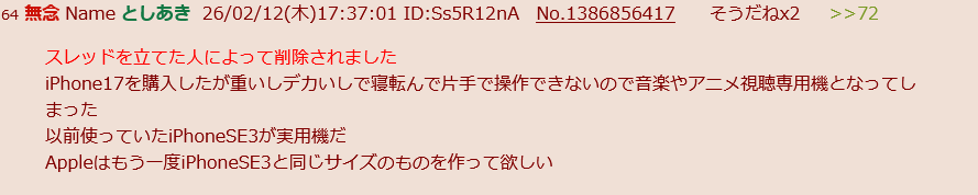 | … | 455無念Nameとしあき26/02/12(木)18:45:40No.1386870477そうだねx2>いつものiPhone17+ポタアンだった |