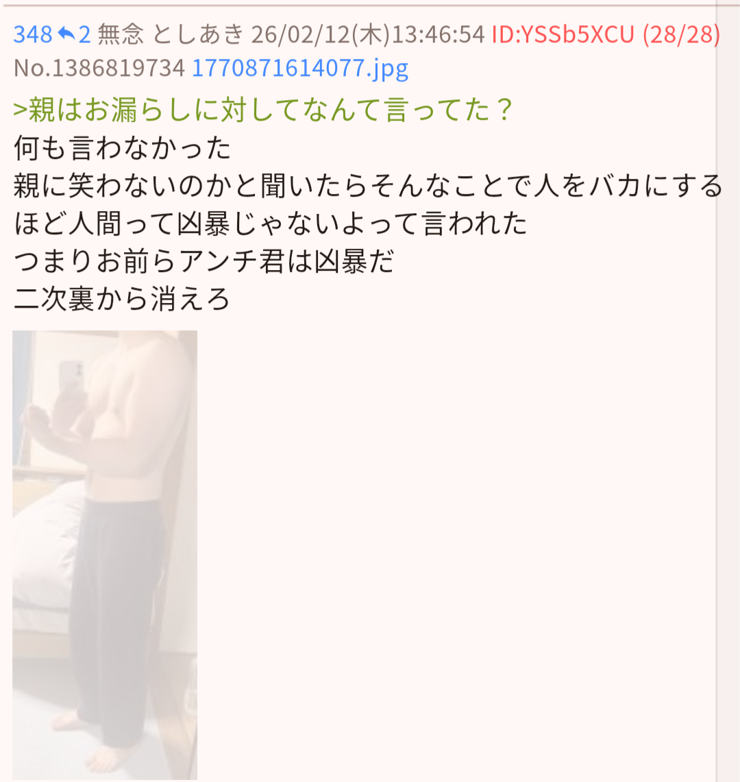 | … | 46無念Nameとしあき26/02/12(木)16:21:57No.1386843756そうだねx1>>漏らしたウンコ付いたままですよ |