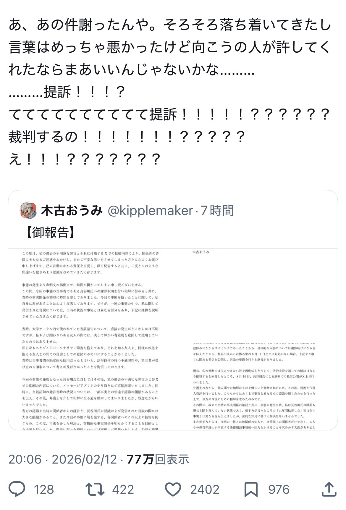 | … | 85無念Nameとしあき26/02/13(金)01:24:14No.1386973005+落ち度のない一般人に訴訟をちらつかせる作家先生か |