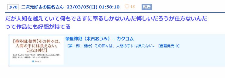 | … | 61無念Nameとしあき26/02/13(金)01:20:56No.1386972586+>この人の作品の続き読みたいって純粋なファンはいないの? |