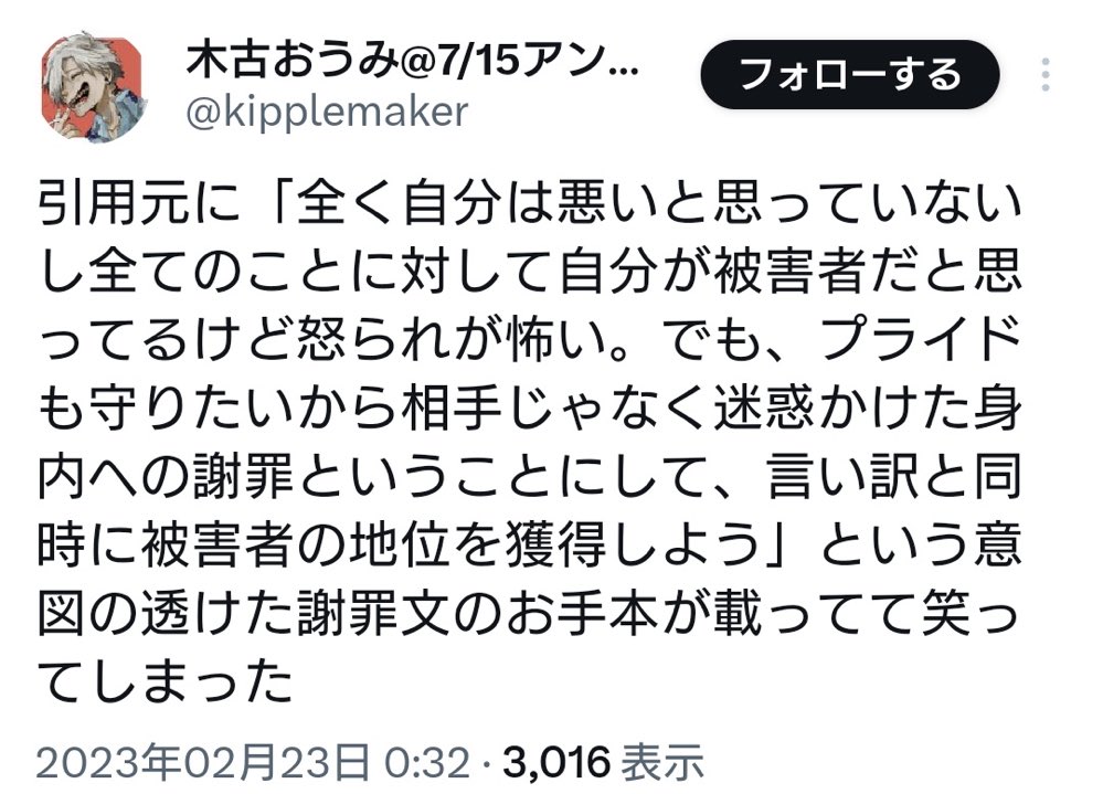 | … | 51無念Nameとしあき26/02/13(金)01:20:00No.1386972447そうだねx6謝罪かと思ったらつべこべつべこべと自己正当化でダメだった |