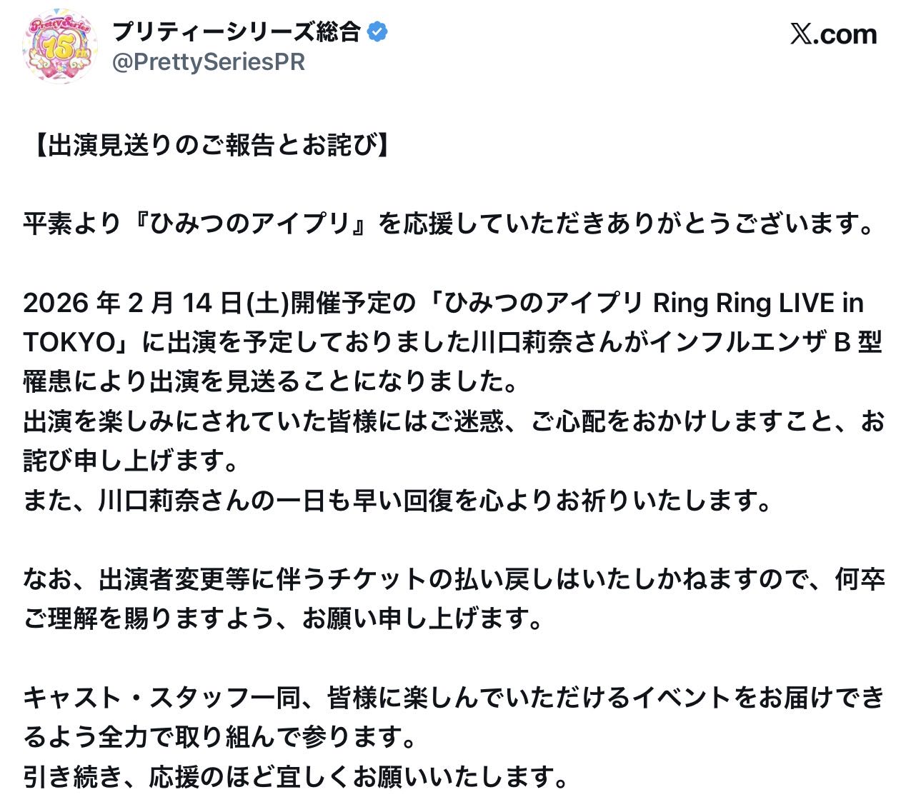 | … | 29無念Nameとしあき26/02/13(金)11:46:20 IP:202.238.*(mics.ne.jp)No.1387026617+>おじさん5年くらいプリティーのライブ行ってるけど直前の出演見送りって初めて見たかも |