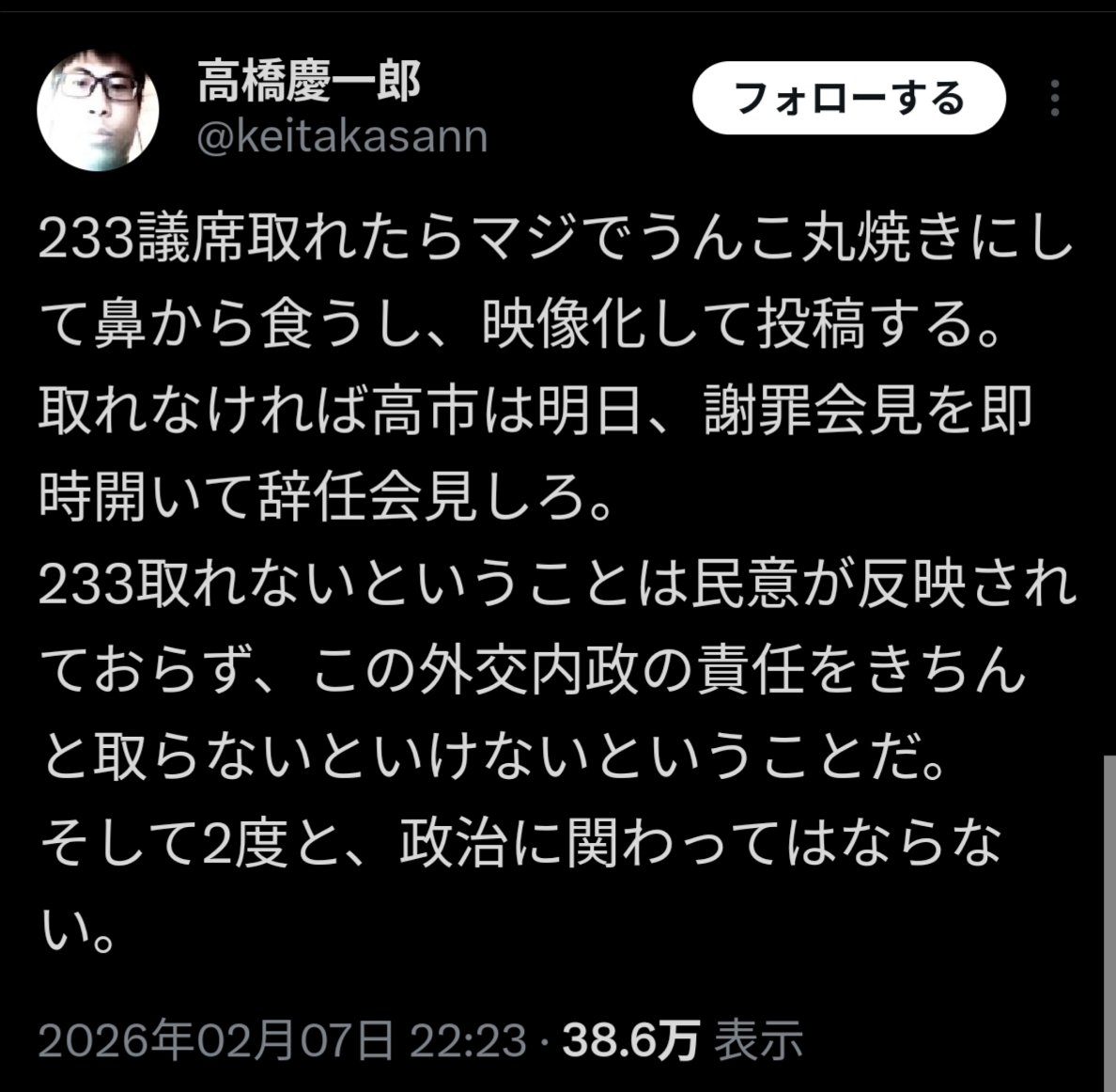 | … | 11無念Nameとしあき26/02/13(金)13:17:54No.1387044256+ピッタリカンカンで233議席て言う話だから無罪 |
